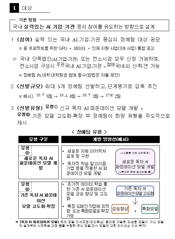 - 책임의 분산과 모호성: "정예팀 공모" 방식은 정부가 직접 주도하기보다, 민간에 개발의 주도권과 책임을 넘기는 듯한 인상을 줍니다. 일반적으로 정부 주도 사업은 정부가 방향을 제시하고 민간이 그 방향에 맞춰 수행하는 형태인데, 이번 사업은 정부가 자원만 제공하고 '결과'에 대한 최종 책임은 민간에 전가하려는 시도로 보일 수 있습니다. 마치 "재료는 줄 테니 알아서 요리하고, 맛없으면 요리사 잘못"이라고 말하는 것과 같죠. 🤷♀️