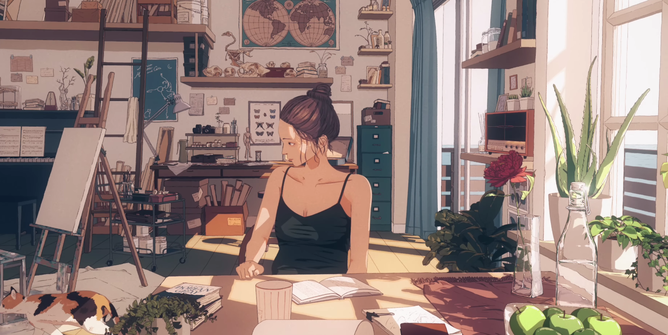연인의 사소한 행동과 미지근한 머그컵은 일상의 따뜻함과 그 온기가 식어가는 관계를 상징한다. 오른손과 왼손의 대조는 감정적 거리감을 암시하며, 세밀한 묘사가 애틋함을 더한다. - “一つでいい 散らぬ牡丹の一つでいい / 君の胸を打て 心を亡れるほどの幸福を”