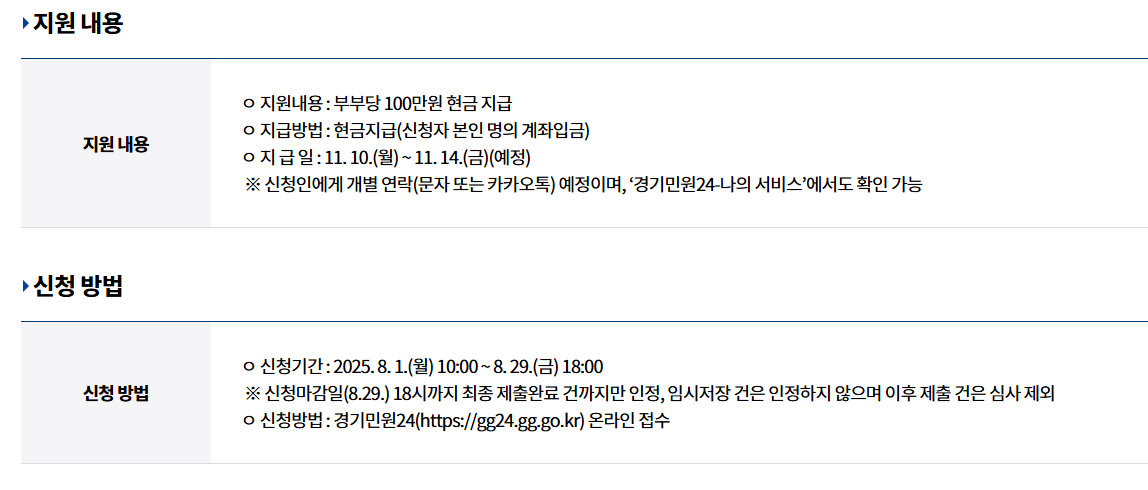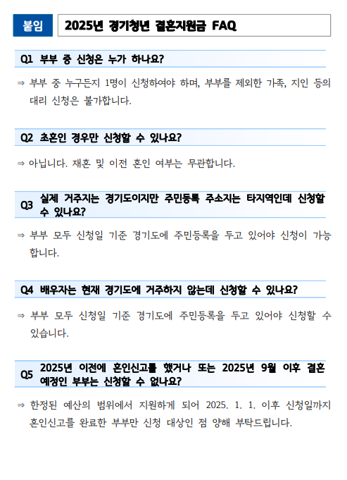 - 거주 요건: 부부 모두 신청일 기준 경기도 주민등록자.