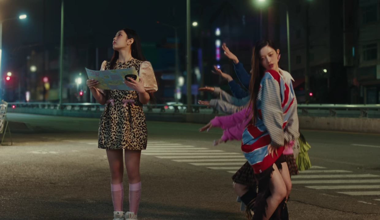 - Chorus와 Post-Chorus: "Dance, do a little dance, do ya, do ya, do you wanna dance? / Do, do, do, do, do, do the da-da / 꿍실냐옹 (Do the dance, ah, oui)" 후렴은 반복과 리듬감으로 춤을 유도하며, "Yeah, yeah, yeah, yes"처럼 긍정적인 대답을 강조해 해방감을 줍니다. "꿍실냐옹"과 "둠칫냐옹"은 고양이 소리를 섞은 놀이적 의성어로, 문화적으로 한국의 '귀여움(kawaii)' 트렌드를 반영합니다. 전체 가사는 서사적 흐름—긴장(Verse) → 갈등(Pre-Chorus) → 해결(Chorus)—으로 구성되어, 청취자가 감정의 롤러코스터를 타며 노래의 스토리를 따라가게 합니다. 이 가사는 Z세대의 불안한 로맨스를 대변하며, 팬들이 공감하며 공유하는 바이럴 요소를 가집니다.